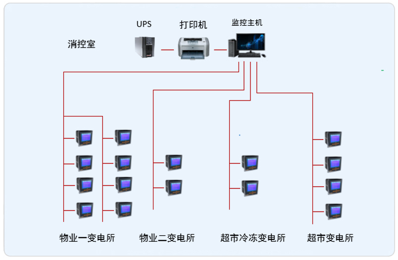 系統(tǒng)采用Acrel-2000型電力監(jiān)控系統(tǒng),整個(gè)系統(tǒng)采用網(wǎng)絡(luò)分布式結(jié)構(gòu),監(jiān)控主機(jī)位于消防監(jiān)控室中,其他4個(gè)配電室分別位于地下一層。該項(xiàng)目實(shí)現(xiàn)了湖州萬(wàn)達(dá)4個(gè)10kV變電所的智能管理。所有監(jiān)控設(shè)備均通過(guò)屏蔽雙絞線至后臺(tái)監(jiān)控主機(jī),從而實(shí)現(xiàn)遠(yuǎn)程監(jiān)控。