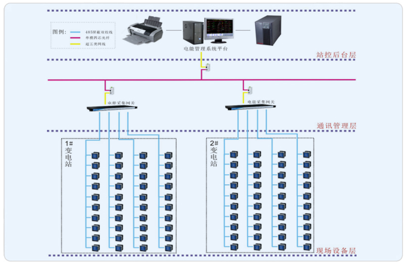 本項目主要是針對海南昌建逸海國際廣場內的10KV/0.4KV的1#,2#變電所設計一套電力監(jiān)控系統(tǒng)。主要是采集10kV多功能網(wǎng)絡儀表電力參數(shù)、開關帶電指示儀開關狀態(tài)及0.4kV變電站多功能儀表的電參量,現(xiàn)場智能表計采用RS485總線組網(wǎng)接入電能管理系統(tǒng),系統(tǒng)主機安裝在1#變電所內。