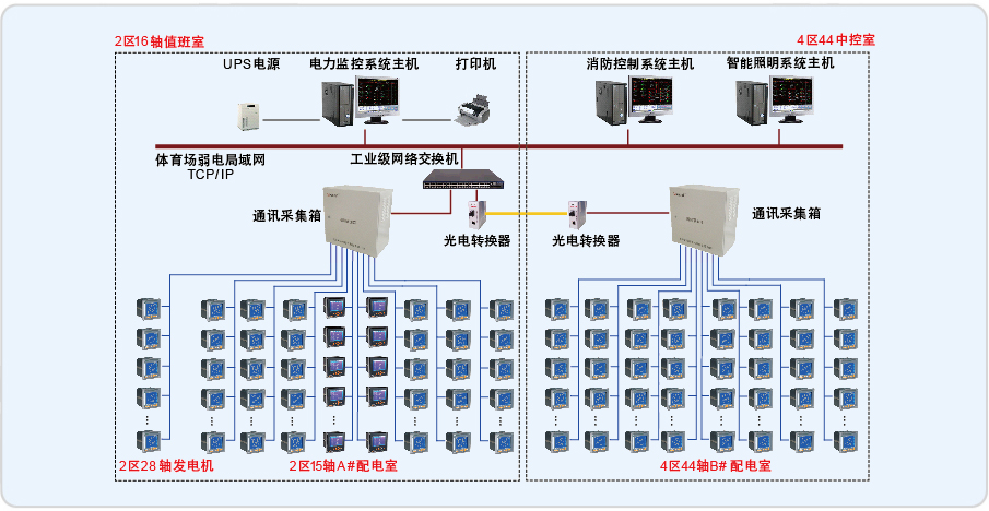 體育場變配電系統(tǒng)60kV以上部分由贊方提供,低壓系統(tǒng)主要變電設(shè)備為4臺1600kW干式變壓器和一臺1600kW應(yīng)急柴油發(fā)電機,分別位于2區(qū)15軸、2區(qū)28軸和4區(qū)44軸配電室的內(nèi),共27臺低壓配電柜,116個配電回路。本電力監(jiān)控系統(tǒng)為三層結(jié)構(gòu),現(xiàn)場設(shè)備層由安裝在低壓配電柜上的多功能儀表組成,經(jīng)由9根RS485總線上傳數(shù)據(jù)。通訊管理層由安裝在15軸監(jiān)控室和44軸B#配電室通訊機柜內(nèi)的通訊服務(wù)器、光電轉(zhuǎn)換器和工業(yè)以太網(wǎng)交換機等設(shè)備組成,其功能是連接現(xiàn)場設(shè)備層和站控管理層。站控管理層設(shè)備(監(jiān)控主機、UPS電源、顯示器等)均安裝在15軸監(jiān)控室的通訊采集箱內(nèi)。