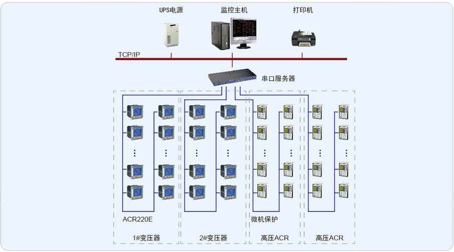 蘇州金閶中學共有一個變配電室,整個配電系統(tǒng)主要有2臺10/0.4 kV配電變壓器和2排高壓進線柜,共計62低壓4個10kV中壓進出線柜,實現(xiàn)了對整個學校的電力供應(yīng)。本項目電能管理系統(tǒng)主要對變電所內(nèi)62個進出線回路及10kV配電回路進行管理,實現(xiàn)電力參數(shù)實時遙測、電能計量、電能報表等功能。