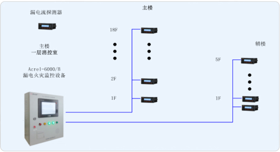 新食堂為地上三層、地下一層,占地面積約為2100平方米,地上建筑面積約為6300平方米。我司承接其電氣火災(zāi)系統(tǒng)的搭建,對安裝于食堂樓層配電箱進線處的ARCM200系列剩余電流火災(zāi)探測器設(shè)計一套Acrel-6000/B電氣火災(zāi)系統(tǒng),由此來實時監(jiān)測樓層內(nèi)重要回路的漏電流,以確保變電所配電系統(tǒng)的電氣安全。