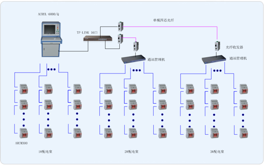 系統(tǒng)組網(wǎng)共分為站控管理層、網(wǎng)絡(luò)通訊層、現(xiàn)場(chǎng)設(shè)備層三層,該項(xiàng)目通訊總線共接入20條通訊總線,總線在樓層配電箱手拉手串接后,接入Acrel-6000/Q電氣火災(zāi)監(jiān)控設(shè)備,組成電氣火災(zāi)系統(tǒng)的大動(dòng)脈。箱體中漏電流互感器通過電流線接入漏電探測(cè)器,漏電探測(cè)器實(shí)時(shí)顯示漏電情況,組成一套信號(hào)穩(wěn)定,精度可靠的電氣火災(zāi)監(jiān)測(cè)系統(tǒng)。現(xiàn)場(chǎng)共有449只ARCM系列電氣火災(zāi)探測(cè)器模塊。