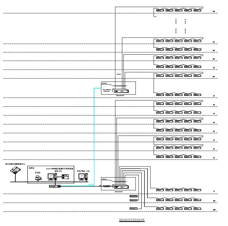 辦公主樓地上二十二層,地下兩層,合計(jì)102塊西安旌旗電子的直接接入型電能表,6塊安科瑞電氣的PZ96L-E4電能表,32塊安科瑞電氣的PZ72L-E4電能表,1塊RS485接口Modbus通訊協(xié)議的水表需要進(jìn)行能耗監(jiān)測(cè)。后臺(tái)位于一層的值班室內(nèi),因此針對(duì)本項(xiàng)目的性質(zhì),設(shè)計(jì)一套能耗系統(tǒng),并在值班室內(nèi)操作臺(tái)處配置一臺(tái)通訊管理機(jī),對(duì)地下配電室的安科瑞電表、遠(yuǎn)傳水表以及裙樓及辦公樓低層的西安旌旗電子電能表進(jìn)行采集。同時(shí)在9層弱電間再設(shè)置一臺(tái)內(nèi)置通訊管理機(jī)的數(shù)據(jù)采集箱,對(duì)高層部分的西安旌旗電子電能表進(jìn)行采集,從9層采集箱至1層值班室操作臺(tái)處后臺(tái)主機(jī)通過(guò)光纖進(jìn)行數(shù)據(jù)傳輸。電表及水表的數(shù)據(jù)采集后按照能耗分類(lèi)分項(xiàng)原則進(jìn)行分析,同時(shí)根據(jù)西安市公共建筑能耗監(jiān)測(cè)系統(tǒng)技術(shù)規(guī)范DBJ61/T 97-2015將數(shù)據(jù)上傳至西安市公共建筑能耗監(jiān)測(cè)平臺(tái)。