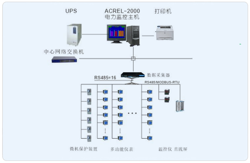 系統(tǒng)采用Acrel-2000型電力監(jiān)控系統(tǒng),分別在利爾達(dá)和利合達(dá)各設(shè)置一套電力監(jiān)控系統(tǒng),實(shí)現(xiàn)對(duì)高低壓配電回路的實(shí)時(shí)監(jiān)控,有利于用電管理。另一方面,電力監(jiān)控系統(tǒng)不僅能夠準(zhǔn)確的表示出回路的用電狀況,它還具備網(wǎng)絡(luò)通訊等功能,能夠與計(jì)算機(jī)、串口服務(wù)器等設(shè)備進(jìn)行組合,從而實(shí)現(xiàn)遠(yuǎn)程監(jiān)控。