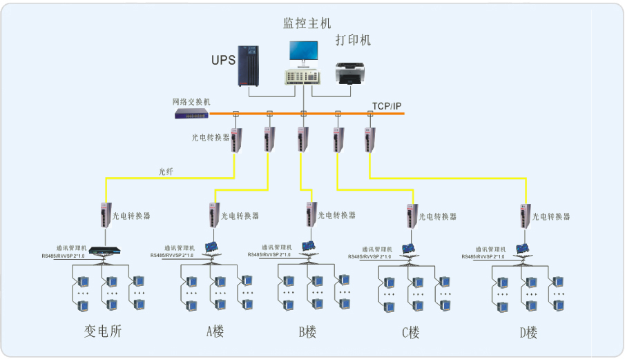 上海金橋德勤通用廠房共1個10KV/0.4KV配電房,在配電房內(nèi)有0.4KV的安科瑞PZ96L-E4儀表102塊;A#有安科瑞PZ96L-E4儀表13塊,B#有安科瑞PZ96L-E4儀表8塊;C#和D#分別有安科瑞PZ96L-E4儀表4塊,上海金橋德勤通用廠房共用安科瑞儀表133塊。對于上海金橋德勤通用廠房的配電情況,在每棟大樓里安放了采集器通過光纖到A棟的消防控制室,配電房的儀表連接至安放在配電室旁邊的通訊機柜再通過光纖到消防控制室,將所有的儀表連接一起,實現(xiàn)對上海金橋德勤通用廠房用電的實時管理。