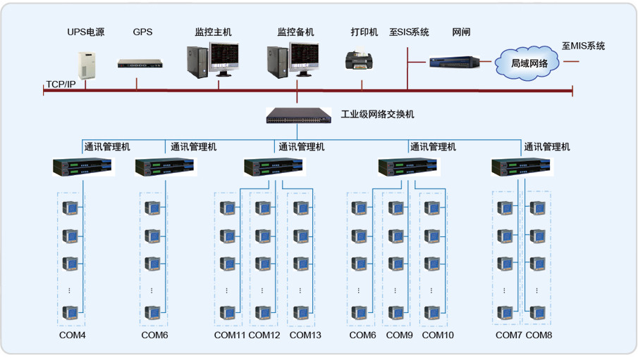 為了能實現(xiàn)對電廠電能量數(shù)據(jù)進行自動采集、遠傳和存儲、預(yù)處理、線損統(tǒng)計及分析的電能綜合管理平臺,合肥電廠電能量管理系統(tǒng)采用了Acrel-3000電能管理軟件,通過現(xiàn)場總線把現(xiàn)場的電能儀表進行集中管理,做到了自動采集、集中控制、智能管理。同時本電能管理系統(tǒng)還具備同廠內(nèi)SIS(監(jiān)控信息系統(tǒng))以及MIS(管理信息系統(tǒng))共享。
