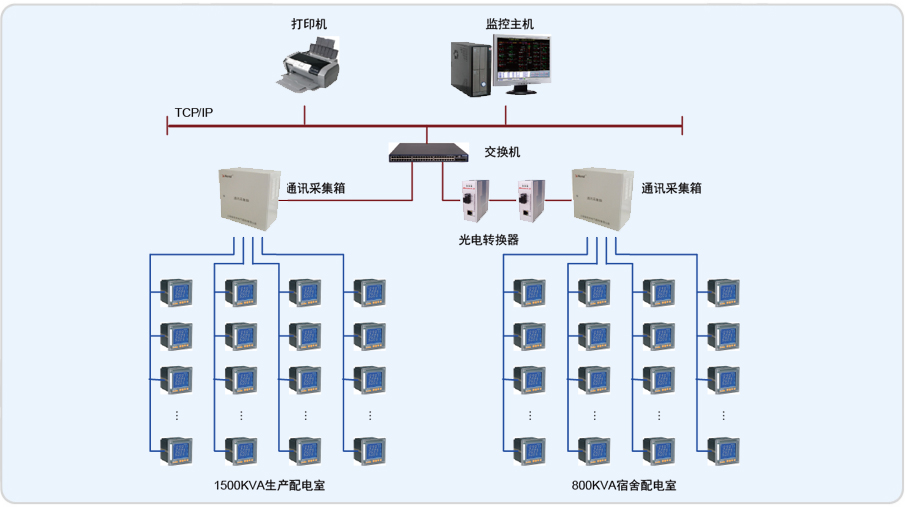山東電力管道工程公司有兩個(gè)配電室:容量1500KVA的生產(chǎn)配電室和800KVA的宿舍配電室,兩個(gè)配電室距離約1500米,為實(shí)現(xiàn)配電系統(tǒng)的規(guī)范化管 理,對(duì)舊的配電系統(tǒng)進(jìn)行改造,兩配電室內(nèi)的老式指針式儀表更換為上海安科瑞公司的網(wǎng)絡(luò)電力儀表,配套Acrel-2000電力監(jiān)控軟件對(duì)現(xiàn)場(chǎng)進(jìn)行監(jiān)控,監(jiān)控室位于生產(chǎn)配電室內(nèi)。為滿足兩個(gè)配電室統(tǒng)一監(jiān)控的要求,容量1500KVA的生產(chǎn)配電室和800KVA的宿舍配電室通過一根單模四芯的光纖相連,經(jīng)光電轉(zhuǎn)換后接入網(wǎng)絡(luò)交換機(jī),進(jìn)而實(shí)現(xiàn)對(duì)現(xiàn)場(chǎng)數(shù)據(jù)的采集,存儲(chǔ),處理,實(shí)時(shí)顯示以及歷史查詢。