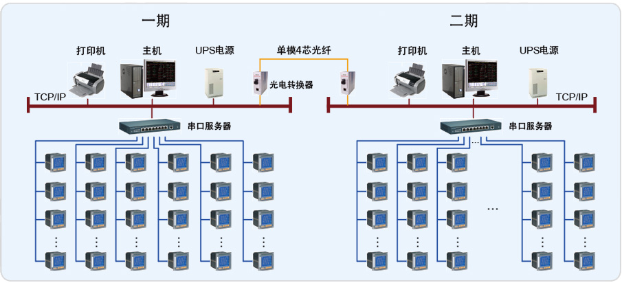 一期配電房由兩個相互獨(dú)立的配電房組成,動力中心配電房包含主室和次室,次室距主室的約30米。其中Acrel-2000電力監(jiān)控系統(tǒng)在動力中心配電室的次室里。動力中心配電房有2臺變壓器(1#變壓器、2#變壓器),共有57臺ACR120EL;現(xiàn)場采用4根屏蔽雙絞總線連接。生產(chǎn)車間配電房中有2臺變壓器(3#變壓器、4#變壓器),共有39臺智能儀表,現(xiàn)場采用2根RS485總線上傳至主機(jī)。