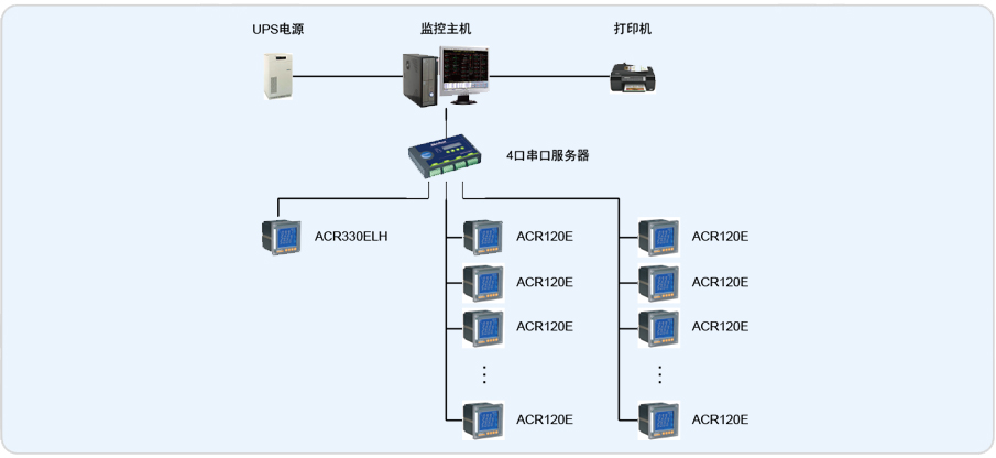 廠區配電中心為本項目提供一套高、低壓后臺監控系統,將對廠區內電氣室中改造安裝的19塊智能電測儀表進行集中監視。具體監控數據為:用電量計量、實時測量相電壓、線電壓、有功功率、無功功率、視在功率、功率因數、頻率等數據,能打印月度用電報表,并有歷史曲線的查詢(時間不小于30天),重要回路需要對其諧波進行測量。各參數及數據通過RS485總線,通過網絡送至配電中心的電工值班室(后臺監控中心)。
