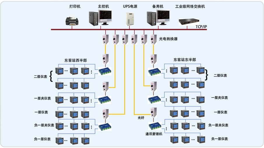 成都東客站電能管理系統采用雙機服務,位于東客站一層西南角值班中心,同時該系統配有6臺管理機,根據現場儀表的分布范圍,合理的分配6臺管理機的管理范圍;為保障數據傳輸的實時性和穩定性,均采用光纖進行數據上傳。在值班室對管理機上傳的數據進行多樣式表現方式,畫面比較形象直觀;系統同時具備向BA系統轉發數據的功能。