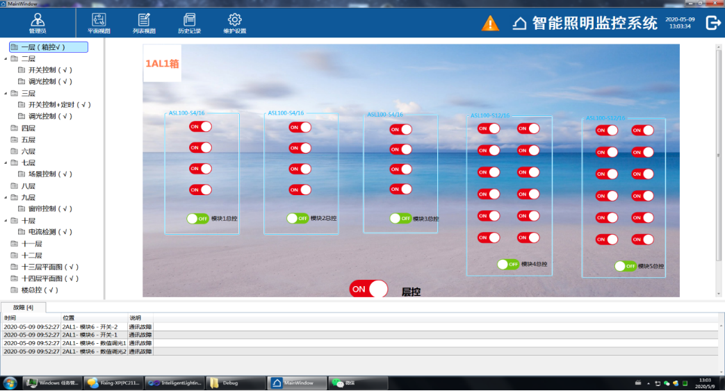 1)實(shí)時(shí)檢測并顯示各個(gè)模塊的在線狀態(tài),反饋現(xiàn)場受控回路的開關(guān)狀態(tài),監(jiān)控界面按照樓層各分區(qū)的布局和回路列表來瀏覽。